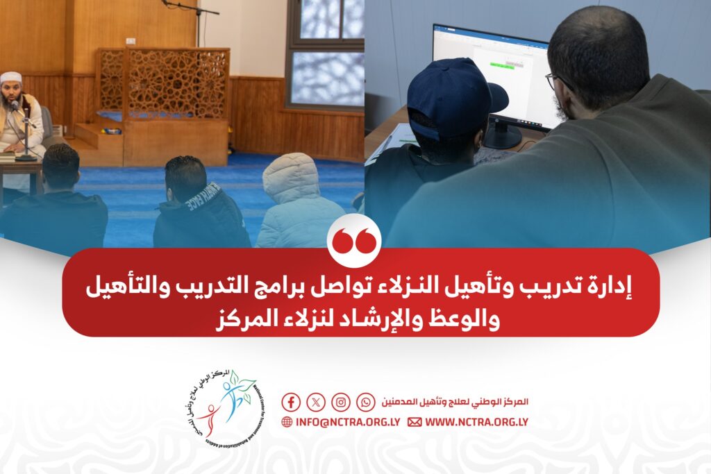 إدارة تدريب وتأهيل النزلاء تواصل برامج التدريب والتأهيل والوعظ والإرشاد لنزلاء المركز Previous Next 24 أبريل 2025م- تُمارس إدارة تدريب وتأهيل النزلاء بالمركز دورًا مهما في إعداد خطط وبرامج التدريب والتأهيل للنزلاء عملاً على تسهيل حصولهم على فرص عمل بعد تعافيهم وخروجهم من المركز. وتواصل الإدارة جهودها في إقامة دورة مبادئ الحاسوب لعدد 16 من نزلاء […]
