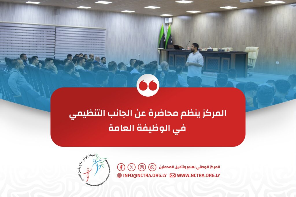 المركز ينظم محاضرة عن الجانب التنظيمي في الوظيفة العامة Previous Next نظّم المركز الوطني لعلاج وتأهيل المدمنين اليوم الخميس محاضرة بعنوان “الجانب التنظيمي في الوظيفة العامة”، قدّمها رئيس اللجنة الاستشارية بالمركز، الأستاذ “عصام سليم بعيو” و تناولت المحاضرة التي شهدت حضور عدد من موظفي المركز عدة محاور أساسية، من أبرزها مفهوم التنظيم الإداري في القطاع العام، […]