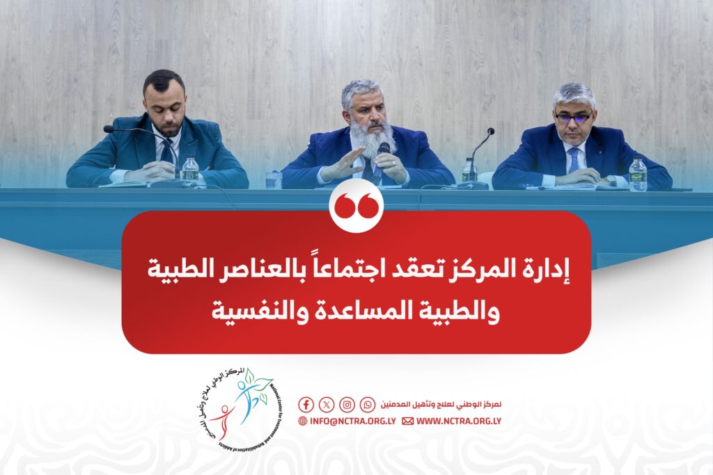 إدارة المركز تعقد اجتماعاً بالعناصر الطبية والطبية المساعدة والنفسية Previous Next 13 أبريل 2025م – ترأس مساعد مدير عام المركز الوطني لعلاج وتأهيل المدمنين صباح اليوم الأحد اجتماعاً بالعناصر الطبية والطبية المساعدة والنفسية بالمركز، بحضور مديري إداراتي الشؤون الطبية وعلاج الإدمان، والإدارية والمالية. وأشاد في مستهل كلمته بما يبذل من جهود من قبل كافة العناصر الطبية […]