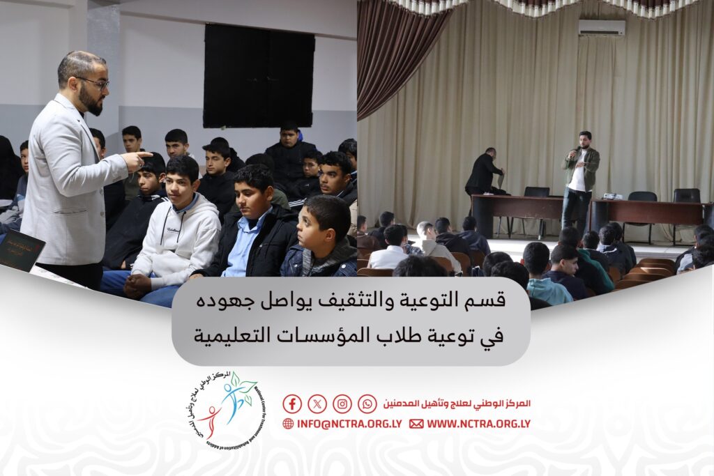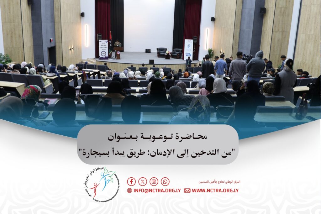 محاضرة توعوية بعنوان “من التدخين إلى الإدمان: طريق يبدأ بسيجارة” Previous Next نظّم قسم التوعية والتثقيف بإدارة الإعلام والتوعية بالمركز الوطني لعلاج وتأهيل المدمنين، بالتعاون مع اتحاد طلبة كلية التقنية الطبية بمصراتة، محاضرة توعوية بعنوان “من التدخين إلى الإدمان: طريق يبدأ بسيجارة”، قدّمها رئيس قسم التوعية والتثقيف بالمركز، الدكتور “طارق القرطي”.وتناولت المحاضرة مخاطر التدخين باعتباره […]