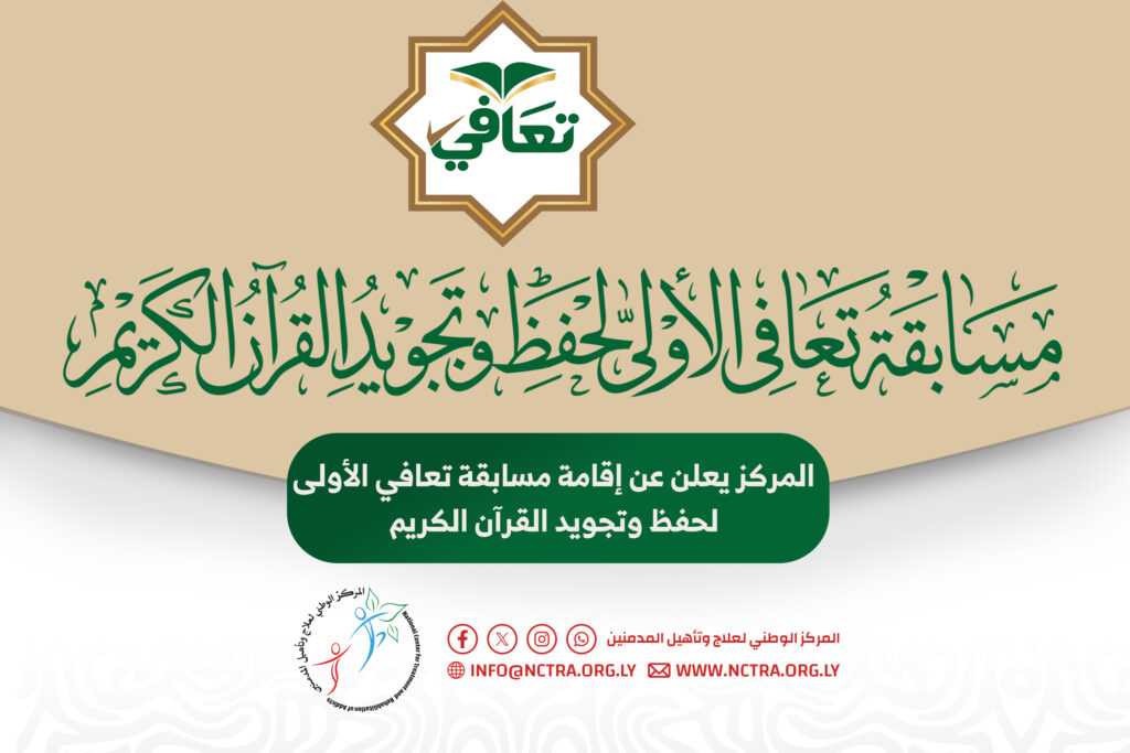 المركز يعلن عن إقامة مسابقة تعافي الأولى لحفظ وتجويد القرآن الكريم يعلن المركز الوطني لعلاج وتأهيل المدمنين عن إقامة مسابقة تعافي الأولى لحفظ وتجويد القرآن الكريم، وذلك وفق الجوانب والشروط التالية: جوانب المسابقة القرآن الكريم كاملًا: ألا يزيد عمر المتسابق عن 22 سنة النصف الأخير من القرآن الكريم: ألا يزيد عمر المتسابق عن 18 سنة […]